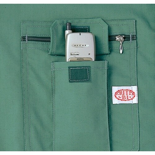 右胸には、携帯電話がすっぽり入るポケットを用意しています。もちろん物落ちを防ぐオーバーフラップ付きです。