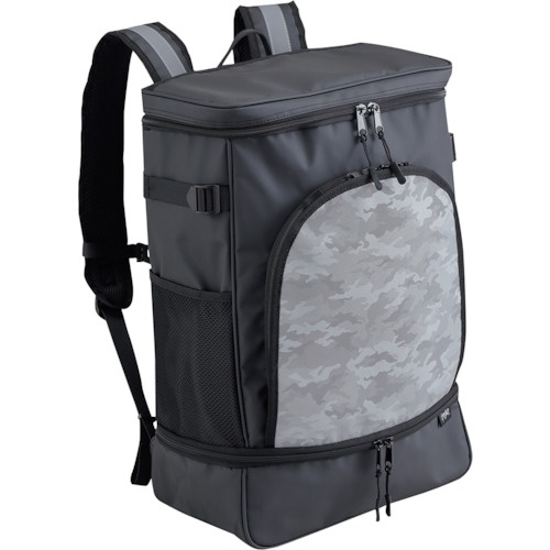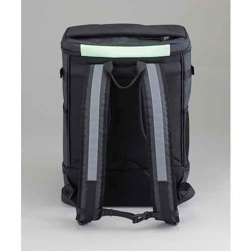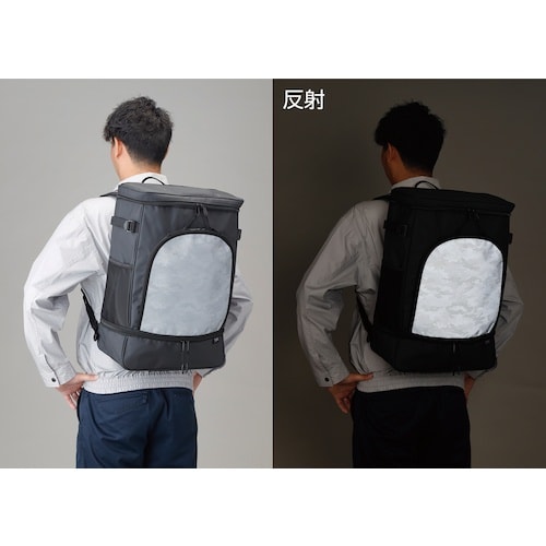 安全靴とヘルメット等、一度に収納してかさばらずに持ち運べます。収納スペースはそれぞれ仕切られているため、他の荷物に匂いや汚れが移りません。素材に撥水性の高いターポリンを使用しています。 |