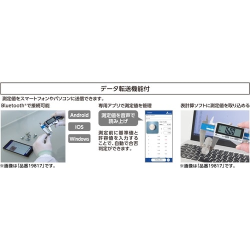 Bluetooth通信機能付で、測定値をスマートフォンやタブレット、パソコンに送信できます。読み取りやすい文字高13mmの大型液晶を採用しました。微調整に便利な微動送り付です。 |