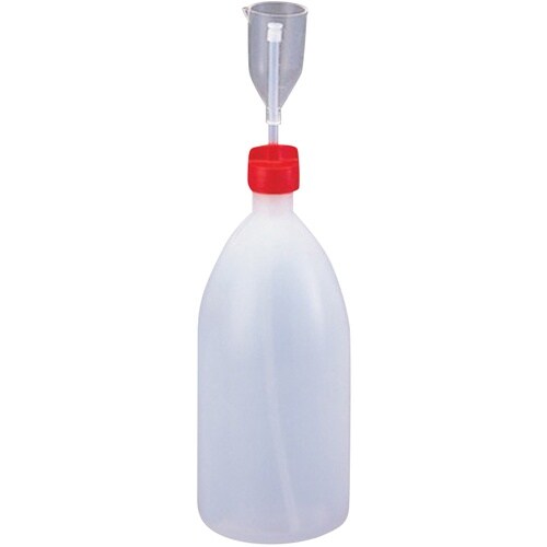 ワンタッチで秤量・分注できるボトルタイプの分注器です。分注パイプに目盛が付いており、カップを上下させて容量を設定します。