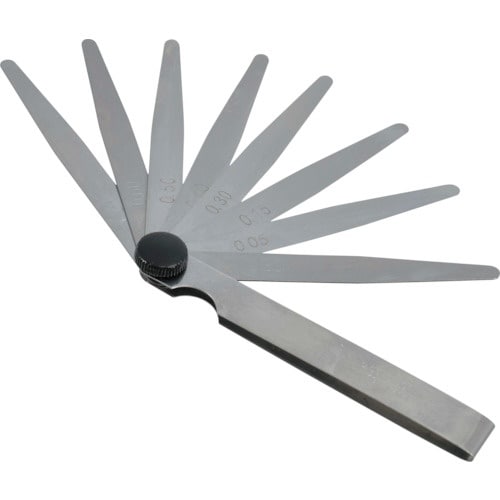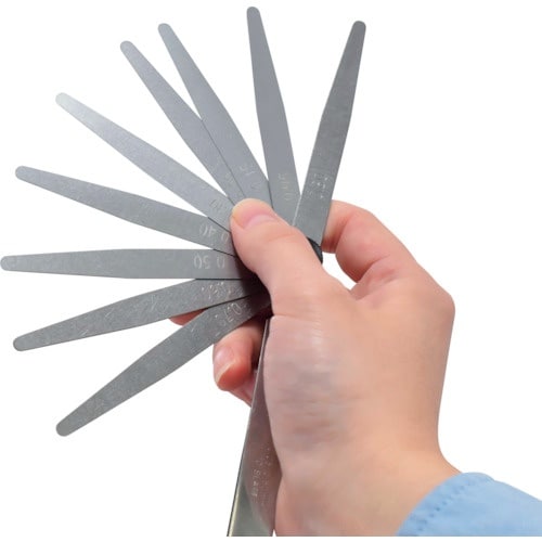 エンジンのバルブクリアランスなど、隙間の測定に使用する隙間ゲージです。対象の隙間に差し込んで計測します。リーフを重ねて使用することもできます。リーフ形状は、先端が細くなっています。 |