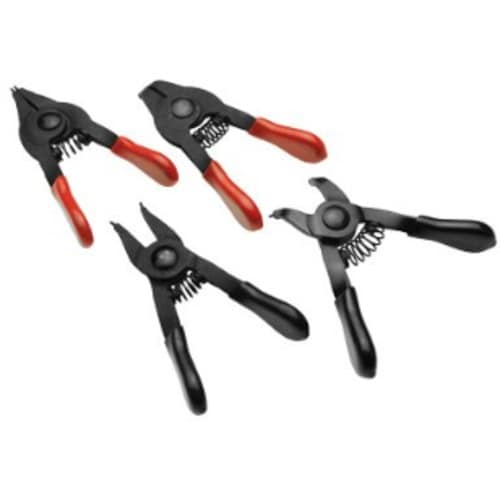 プライヤーなどでは代用が効かない、スナップリングの脱着ができるミニタイプのプライヤーです。先端形状がストレートタイプの穴用と軸用、先端形状45°タイプの軸用と穴用の合計4種類がセットになっています。 |