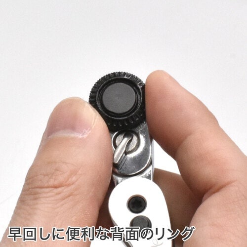 ギヤ数は72Tで狭い場所でも使用でき、ラチェット背面のリングは指先での早回しに便利です。 |