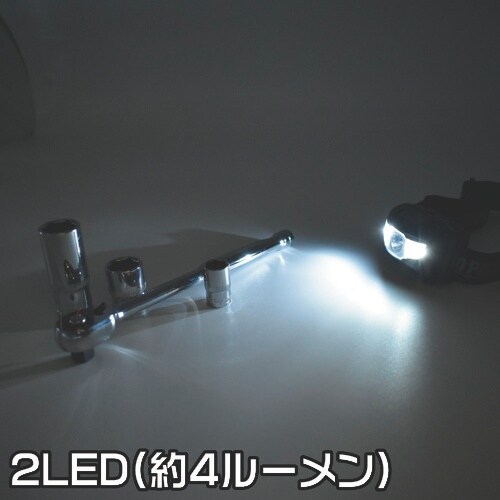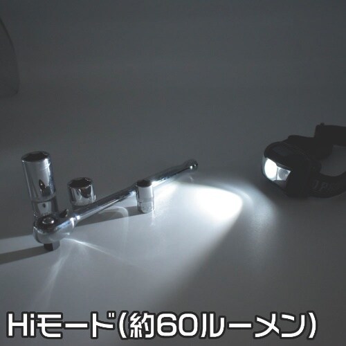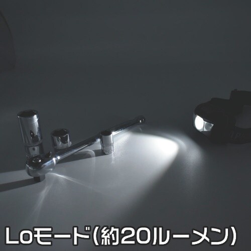 頭部にバンドで装着するので、両手を自由に使うことができます。ライトの照射は約45°の範囲で5段階の角度調節で、手元や足元を照らすことができます。 |