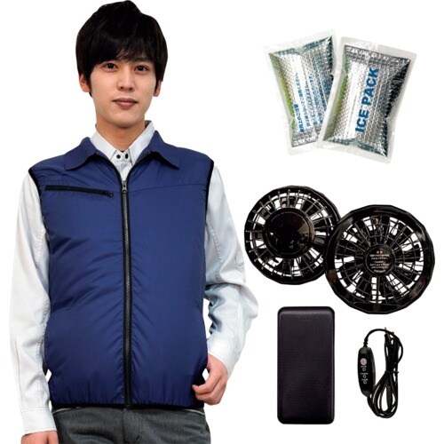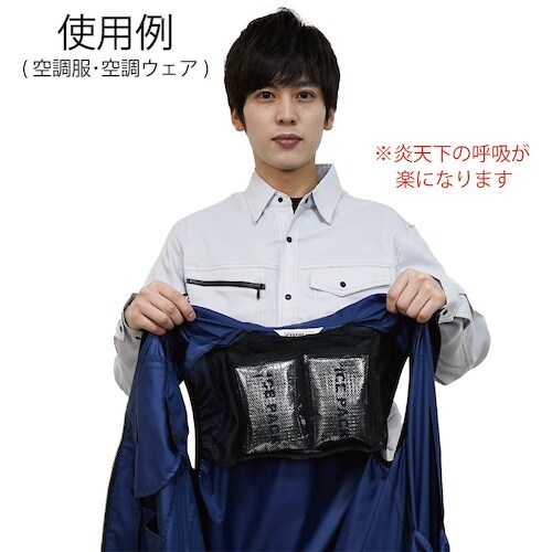 保冷剤が常時フレキシブルに身体に密着効果を体感できる空調ベストを新開発しました。素材に高密度ポリエステルを採用し、気密性を高めたカジュアルな着心地のユニセックス仕様です。 |