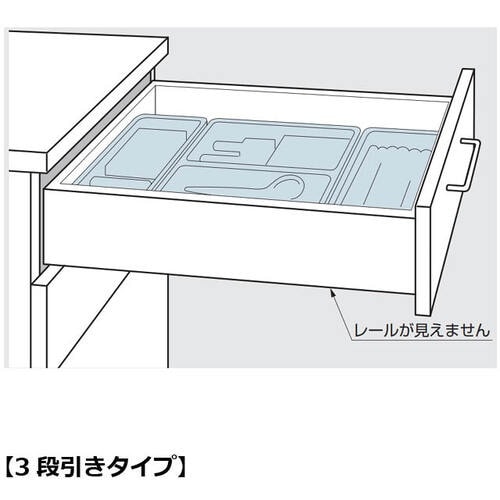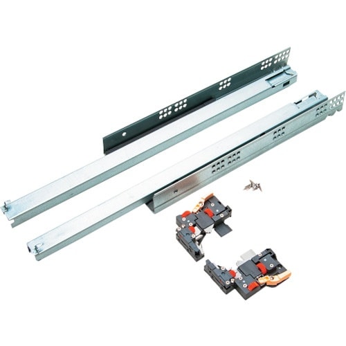 3段引のスライドレールです。スライドレールが外側から見えないため、キャビネットなどのデザイン性を損ないません。セルフ、ソフトクロージング機構は、閉じる約30mm手前から働きます。