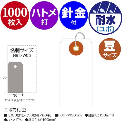 色:白 | 内容:50枚×20束 | 縦(mm):65 | 横(mm):30 | 厚さ(mm):1 | 穴径(mm):3 | 材質・仕上げ:合成紙 |…