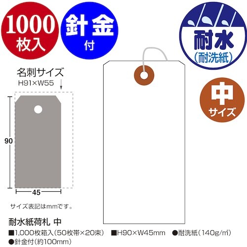 色:白 | 内容:50枚×20束 | 縦(mm):90 | 横(mm):45 | 厚さ(mm):1 | 穴径(mm):3 | 材質・仕上げ:耐洗紙 |…