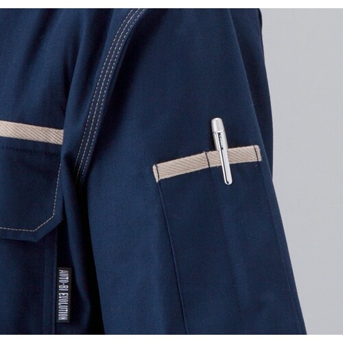 胸ポケット上部には、ベージュカラーのラインテープを採用。ゆったりサイズです。自動車整備などに。作業全般、他。