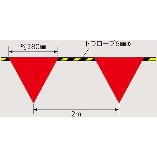 視認性に優れたトラ柄のロープに、三角旗が等間隔に付けられた標識ロープです。ロープは耐薬品性、耐候性に優れています。危険箇所、立入制限箇所の区分けに。 |