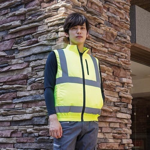 素材に高密度ポリエステル100%の蛍光色生地を採用して視認性を高めるとともに、気密性の優れた着心地の良いユニセックス仕様の空調付安全ベストです。ウェアに高輝度布反射材を縫付け安全性を高めています。 |
