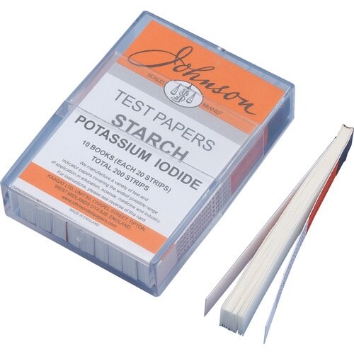 遊離塩素、臭素、オゾンなどの酸化剤により、ヨウ化カリウムが酸化され生じたヨウ素と反応することで青色を呈します。 |