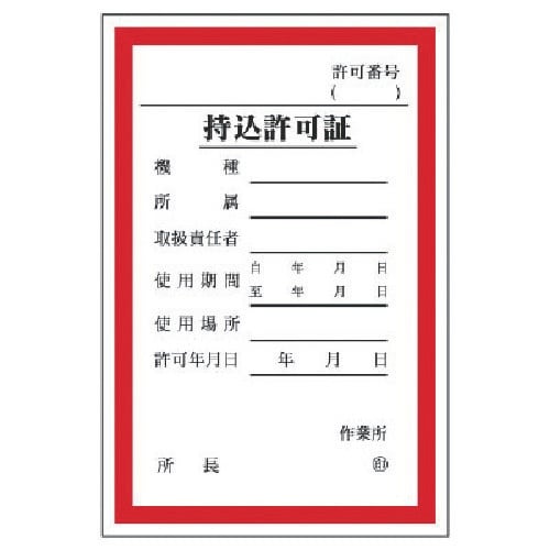 表示内容:持込許可証(許可番号・機種・所属・取扱責任者・使用期間・使用場所・許可年月日・作業所・所長) | 縦(mm):150 | 横(mm):100…