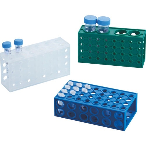4面に異なる径の穴が空いており、マイクロチューブや遠心管を立てられるラックです。オートクレーブ滅菌(121℃15分)が可能です。 |