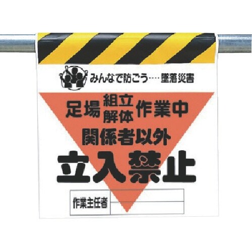 表示部の三角部分は色鮮やかでよく目立つ蛍光色、作業者へ注意を喚起します。単管、トラロープ、コーンバー等への着脱が簡単なマジックテープ式です。ビニールターポリンを使用していますから、とても丈夫です。 |
