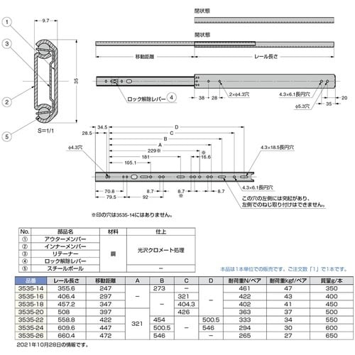3/4スライドの2段引スライドレールです。レール全開時にその状態で固定します。ロック解除レバーの操作で解除します。ロック解除レバーの操作でインナーメンバーを取り外せます。