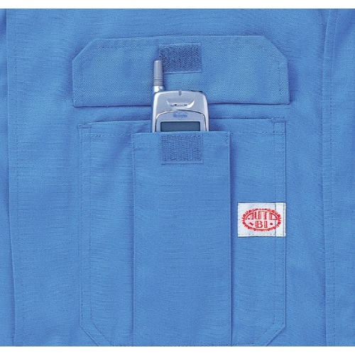 右胸には、携帯電話がすっぽり入るポケットを用意しています。もちろん物落ちを防ぐオーバーフラップ付きです。自動車などの整備。作業全般に。