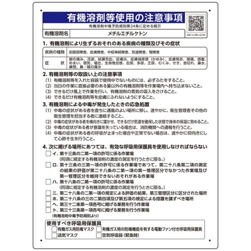 表示内容:有機溶剤等使用の注意事項 メチルエチルケトン | 取付仕様:ビス止め、両面テープ止め | 縦(mm):600 | 横(mm):450 | 厚…