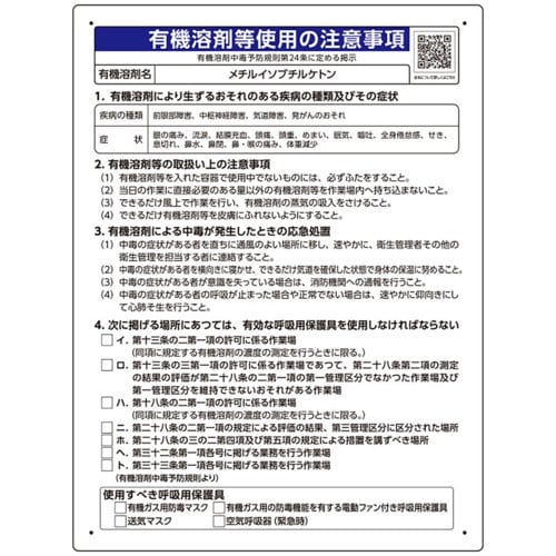 表示内容:有機溶剤等使用の注意事項 メチルイソブチルケトン | 取付仕様:ビス止め、両面テープ止め | 縦(mm):600 | 横(mm):450 |…