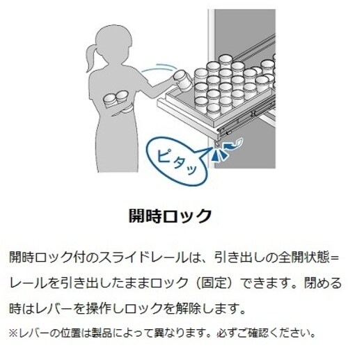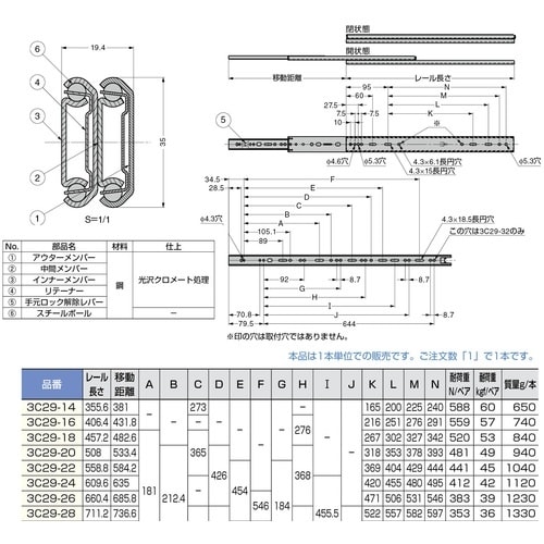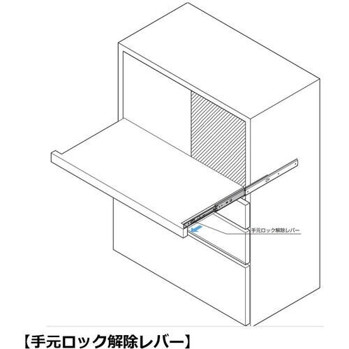 インナーメンバーを完全に引き出せる3段引のスライドレールです。レールを全開にすると、全開した状態で固定します。ロック解除レバーの操作で解除します。