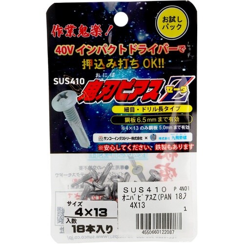 下穴不要で鋼板を高速締結でき、耐久性も優れています。鋼板6.5mm、(4x13は5mm)SUS鋼板4.0mmまで下穴なしで締結可能です。 |