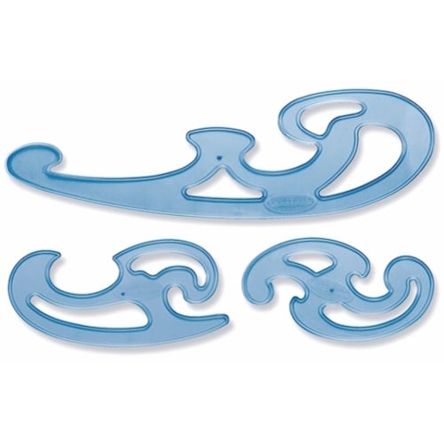 13.7cm、15.8cm、30.5cmと大きさと形の異なる3枚の定規を使い、様々な曲線が描ける定規です。 |