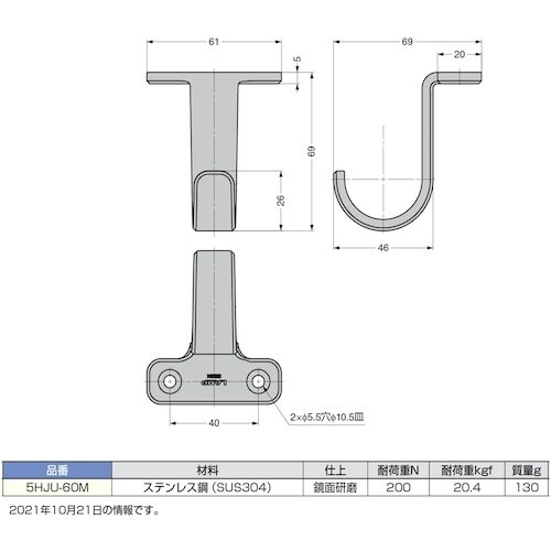 面取りを施した、安全でデザイン性に優れた天付フックです。曲げの内側まで丁寧に磨き上げられています。厚み5mmと重厚な造りです。 |