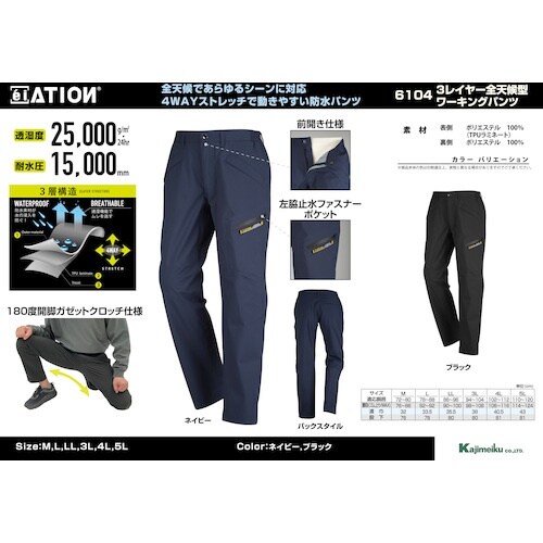 カジメイク カジメイク 6104 3レイヤー全天候型ワーキングパンツ ブラック LL A015-6978
