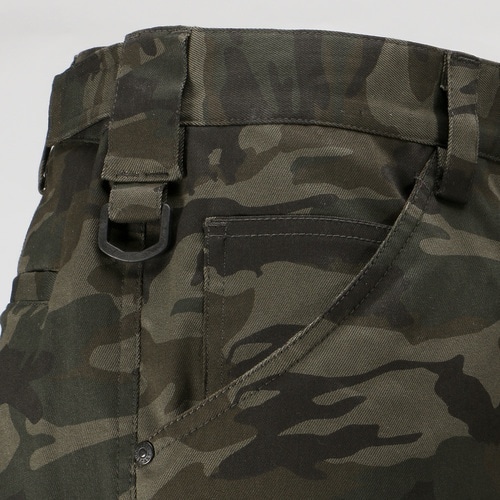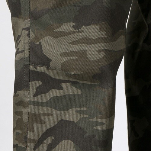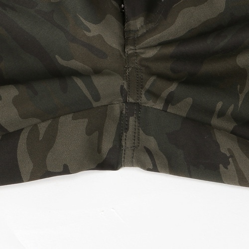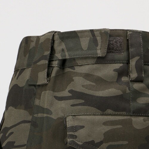 動きやすい伸縮性のある素材の迷彩柄ワークカーゴパンツ。ウエストはゴムではなく両脇のマジックテープで調節するタイプなので、ベルトと併用すればお好みのフィット感に調節できます。作業全般、アウトドアに。