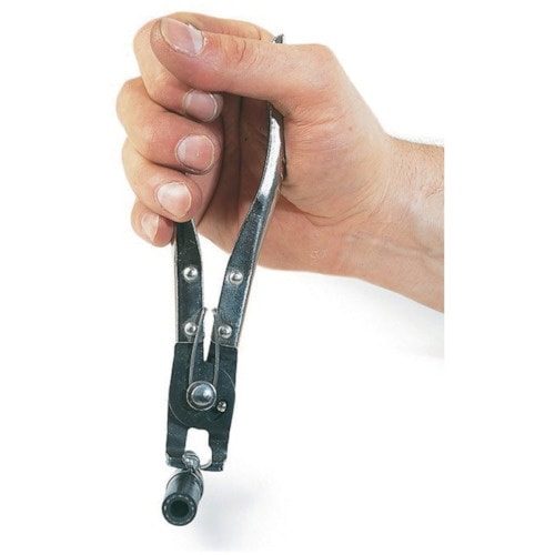 再利用可能なラッチ式ホースクランプ(CLICタイプ)用です。取り付け取り外しが工具を180°回転するだけで出来ます。90°曲がりタイプです。 |