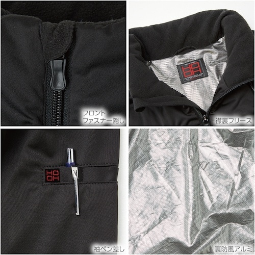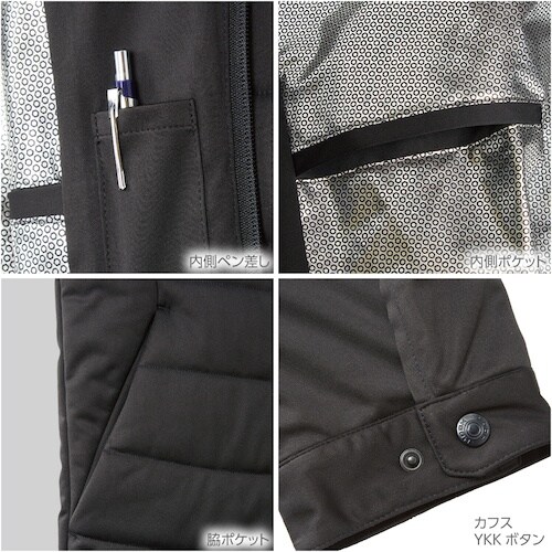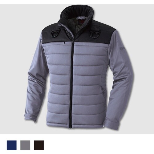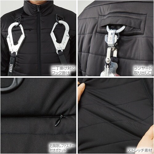 フルハーネス対応の裏アルミ防風防寒ブルゾンです。ストレッチ素材で、袖部分には中綿が入っていないため動きやすさバツグンです。高所作業に。防寒着に。外作業に。アウトドアに。普段着に。