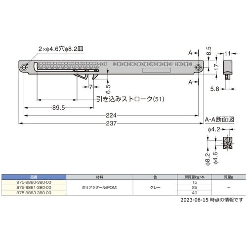 ※エアーダンパーを組み合わせて使用する場合、スライドレールや引戸金物の取り付け・納まりが指定の寸法から変更になる場合があります。エアーダンパーの機能には、扉質量・扉寸法のバランス、また、引戸の動きのスムーズさなどが影響します。実際に試作などで動作をご確認の上、ご使用ください。水気のある所では使用しないでください。急激な温度変化により、作動速度のばらつきがあります。画像は同シリーズのいずれかの製品であり、こちらの品番のものとは外観が異なる可能性があります。