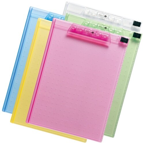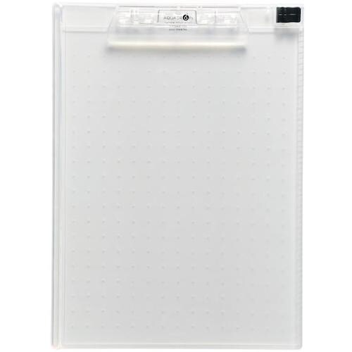 キラキラ光る水玉をイメージしたAQUA DROPsシリーズです。ペンホルダー付きの透明感あふれるクリップボードです。ボード裏面はキラキラ光る水滴をイメージしたピンドットエンボス入りです。