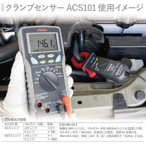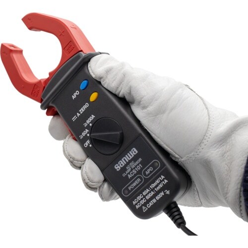 デジタルテスター接続用の直流・交流電流クランプセンサーです。600Aまで測定が可能です。オートパワーオフ(約20分)機能付きです。設備機器メンテナンス。 |