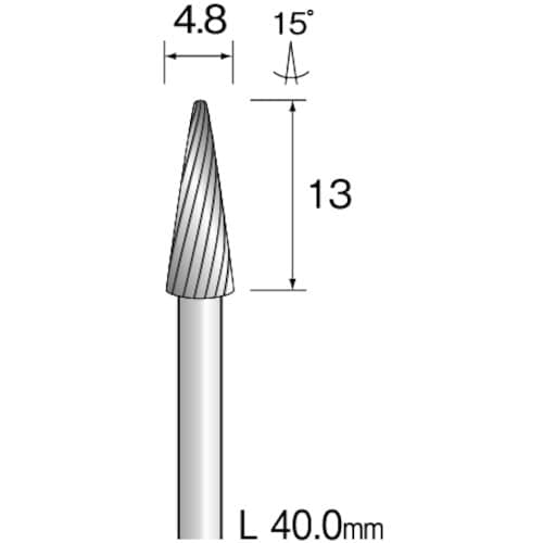 形状:スパイラルカット | 刃径(mm):4.8 | 刃長(mm):13.0 | 軸径(mm):3.0 | 全長(mm):40.0 | 最高使用回転数…