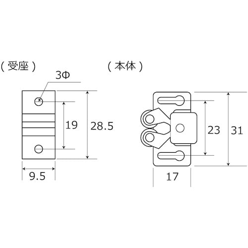 受板用推奨皿ねじ(mm):3.1×13 | 色:ステンレス色 | 本体取付穴寸法(mm):23.5 | 規格:中 | サイズ(mm):31x17 | …