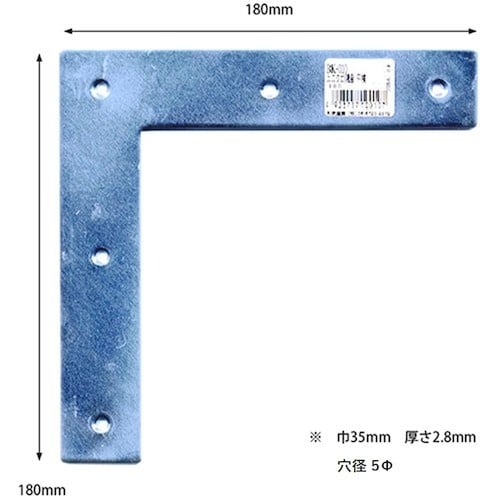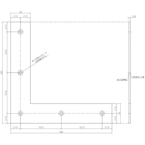 板厚(mm):2.8 | 穴径(mm):5 | 穴数(個):5 | W(mm):35 | L1(mm):180 | L2(mm):180 | 穴径(φ…