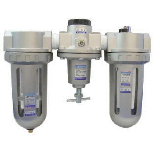 FRLをニップルで接続した大容量の3点ユニットです。オートドレン付きです。圧縮空気のゴミ・水分を除去し、圧力を調整し、潤滑油を圧力空気に混入させる機器です。 |