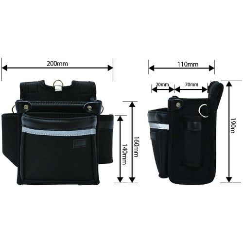 摩耗や釘の突き抜けに強い高密度1680デニール100%ナイロンを使用しています。反射テープ付きで視認性バツグンです。ポケットの縁に反しが無く指を痛めない仕様です。工具全般収納に。