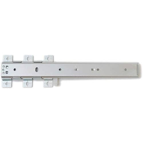 引き出しの底にレールを取り付ける底引きタイプです。引き出しても筐体側にスライドレールが見えません。レバー操作でアウターメンバーを取り外せます。本体の厚みは、わずか19.5mmと薄型です。 |