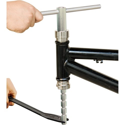 ヘッドワンを均一に押さえ、より軽い負荷で正確に圧入できます。別売のエクステンションバーを使用することで長いヘッドチューブにも対応します。 |
