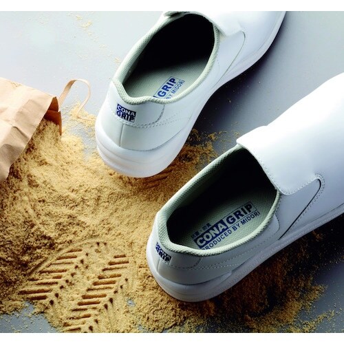 粉職場用に開発されたソールで、粉等の微粒子によってスリップを起こしやすい床でもしっかりグリップします。甲部は凹凸が無く、振りかかった粉汚れも簡単に払い落とせます。