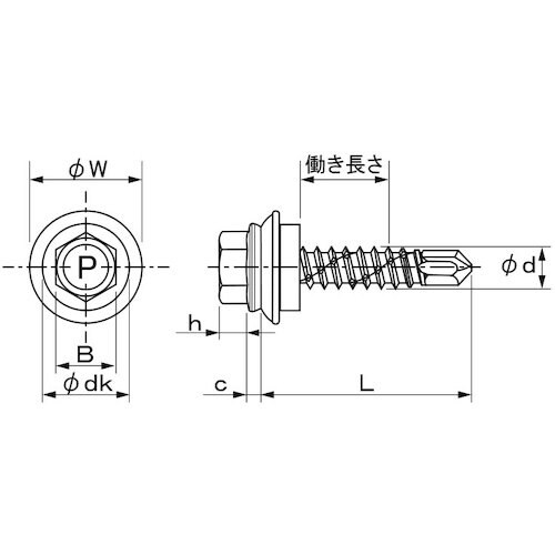 通常のHEX(六角頭)に座金とゴムをセットにしたドリルねじです。止水性が必要な場所にお使いください。 |