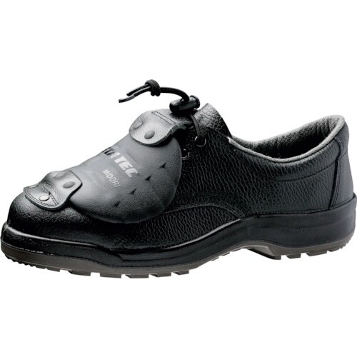 足甲を落下物から保護する甲プロテクタ付です。(JIS記号M合格)軽量で親指を圧迫することなく着用できるワイド樹脂先芯です。鋼製先芯と同じ安全性でサビなどの心配もありません。
