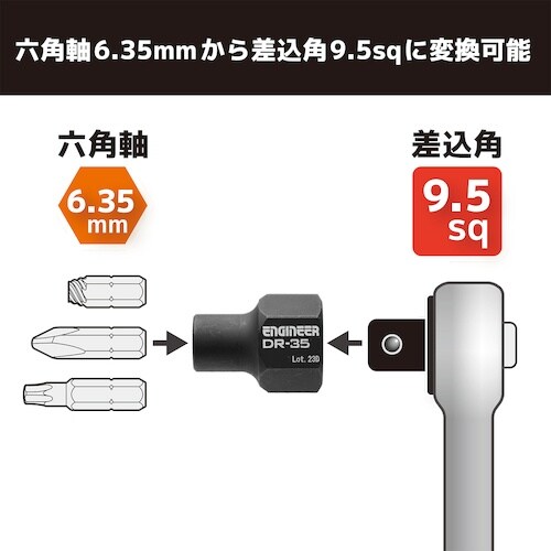 ネジモグラ 極短を装着してパワフルな作業を実現するアダプター。ネジモグラ 極短をお手持ちのラチェットハンドル(3/8inch)に取り付けられるため、固く締まったネジにも使用できます。 |