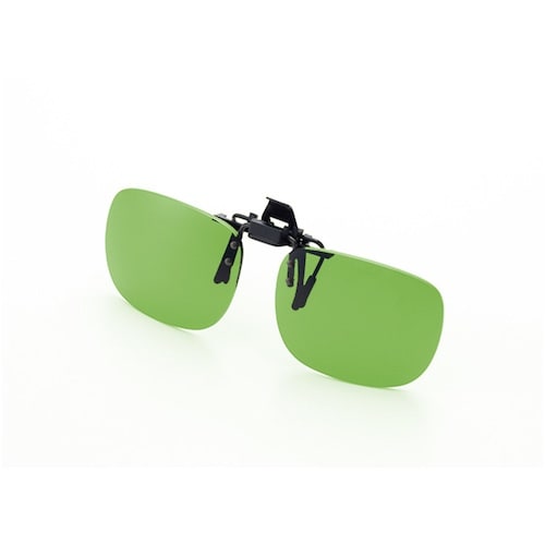クリップオンでワンタッチ装着できる前掛け遮光メガネです。 |