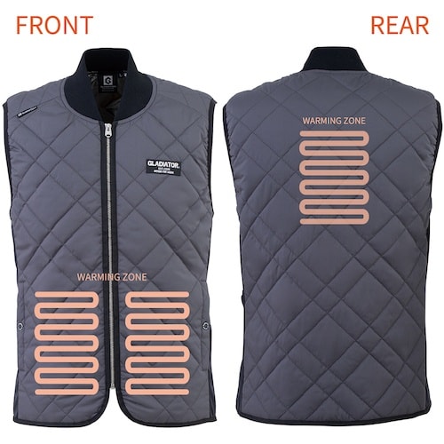 ハードワークにも対応した電熱ウェアです。風が入りにくく、暖かい衿フライス仕様の立衿が冷気の侵入を防ぎ、首元の温かさをキープします。男女兼用ユニセックス仕様の防寒ヒートベスト/発熱ベストです。 |