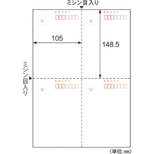 しっかりした厚みがある郵便番号枠付きはがきです。ミシン目で切り離すと4枚の郵便はがきになります。 |