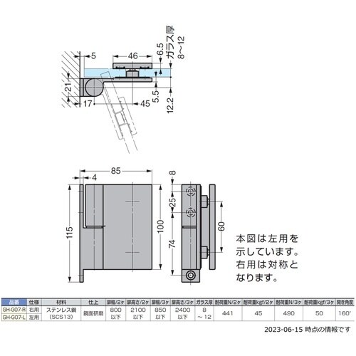 | 注意事項 | ※設置場所に合わせて別売品のガラスエッジプロテクターをご使用ください。ねじの仕上を統一したい場合は付属ねじではなく別売品の研磨されたねじ(六角穴付皿ボルトM5×15、十字穴付タッピンねじM5×50)をご使用ください。 |