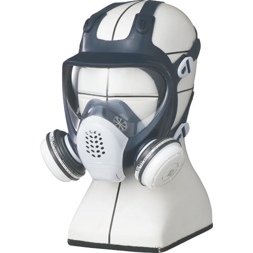 アイピースが傷つきにくく、フード付き防護服との併用を考慮した形です。写真は吸収缶CA−304L3/OV付きです。 |